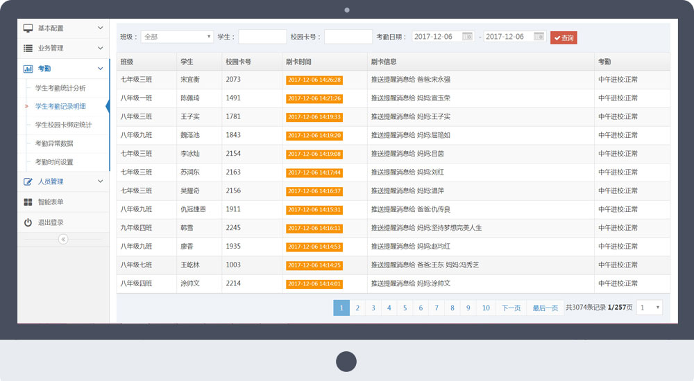 采用先进的RFID技术,无需刷卡自动识别,时时推送进出校通知到家长手机端,异常数据及时通知老师、家长
